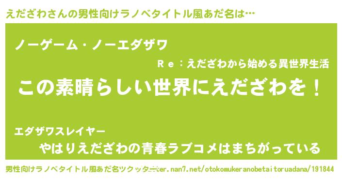 | 女子向けラノベタイトル風あだ名 | 『悪役えだざわに転生したようですが、知った事ではありません』 |