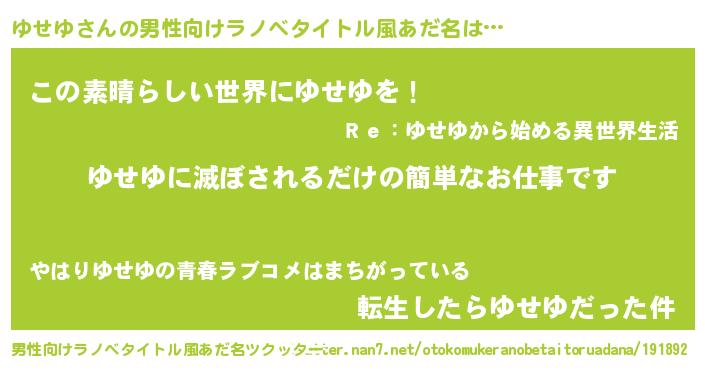 | 胡散臭い通販商品みたいなあだ名 | 『あなたにだけ特別に提供する世界で10本だけ現存している希少なブランデー…その名も「ゆせゆ」』 |