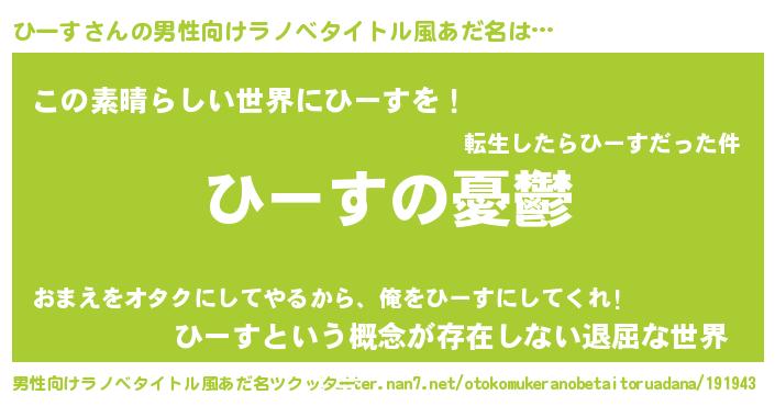 | 女子向けラノベタイトル風あだ名 | 『ひーす姫と円卓の騎士』 |