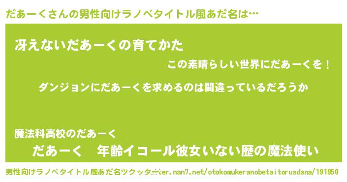 | 女子向けラノベタイトル風あだ名 | 『だあーくの卵を拾いまして』 |