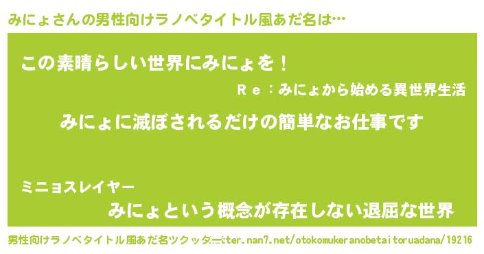 | 意味不明あだ名 | 『住所不定無職みにょ(6歳)』『自称みにょ』 |