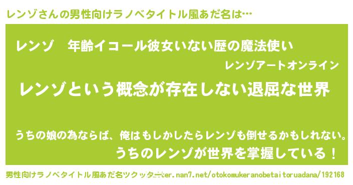 | 女子向けラノベタイトル風あだ名 | 『異世界で失敗しない100のレンゾ』 |