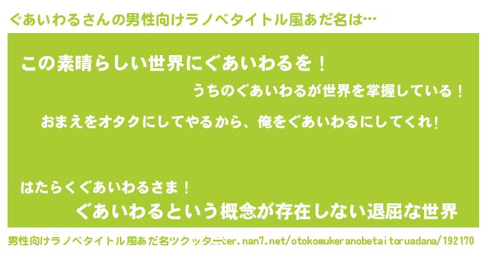 | 女子向けラノベタイトル風あだ名 | 『ぐあいわる夫妻のなれそめ』 |