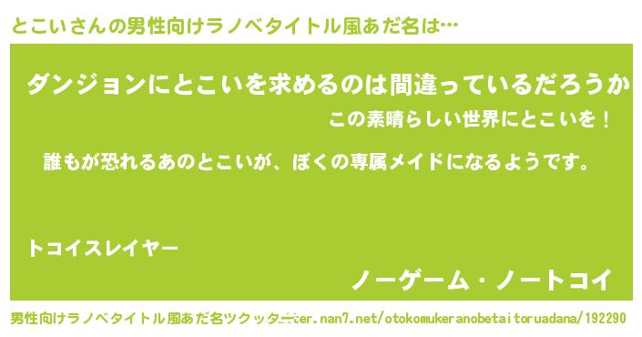 | ヒーロー風カッコイイあだ名 | 『ネオトコイ』『魔戒騎士トコ』 |