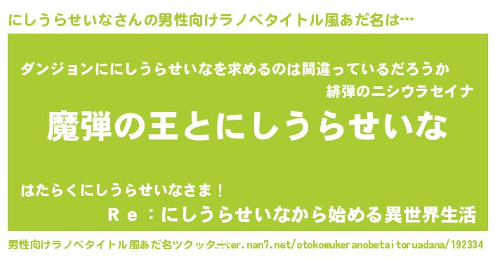 | 女子向けラノベタイトル風あだ名 | 『にしうらせいなが死なない童話 林檎のにしうらせいなの診療簿』 |