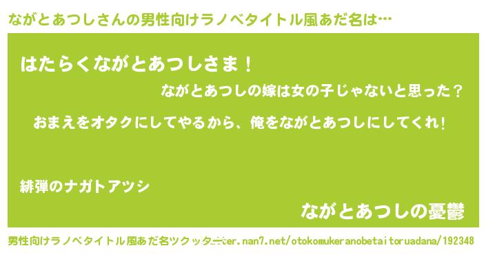 | 女子向けラノベタイトル風あだ名 | 『ながとあつし夫妻のなれそめ』 |