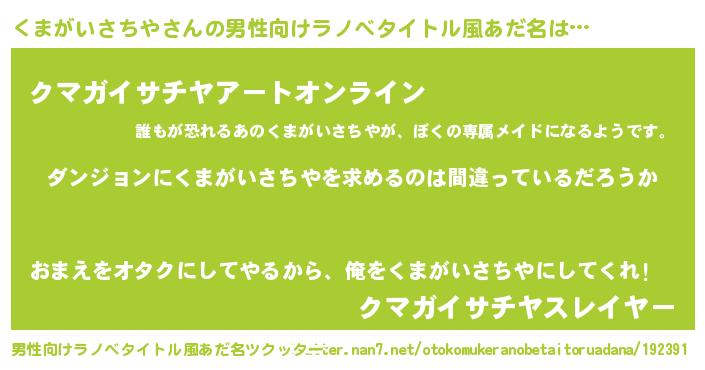 | 女子向けラノベタイトル風あだ名 | 『くまがいさちやは平凡を望む』 |