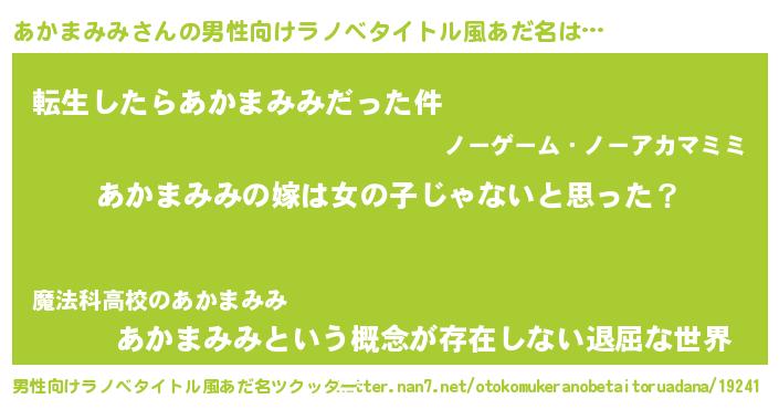 | 女子向けラノベタイトル風あだ名 | 『あかまみみの卵を拾いまして』 |