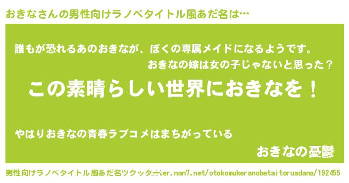 | 胡散臭い通販商品みたいなあだ名 | 『あなたにだけ特別に提供する限定10本のレアな日本酒…その名も「おきな」』 |