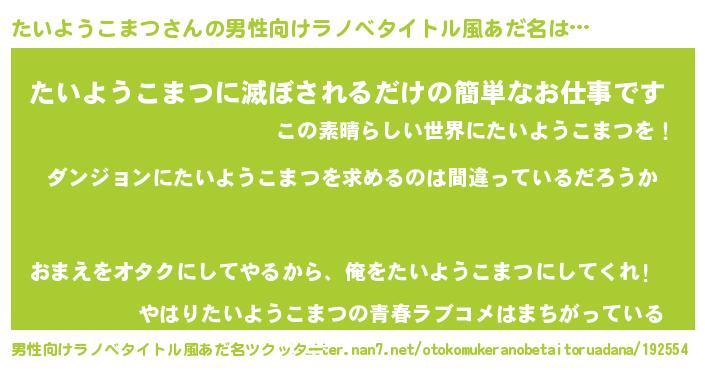 | 女子向けラノベタイトル風あだ名 | 『たいようこまつの卵を拾いまして』 |