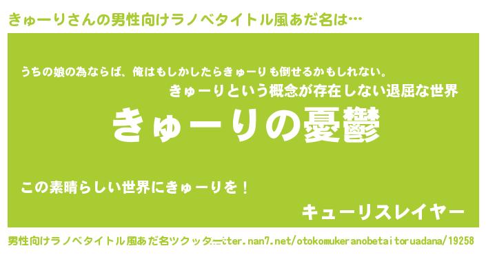 | 女子向けラノベタイトル風あだ名 | 『(仮)きゅーりのやんごとなき事情』 |