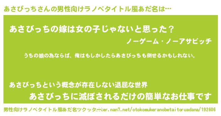 | 女子向けラノベタイトル風あだ名 | 『あさびっち伯爵の花嫁』 |