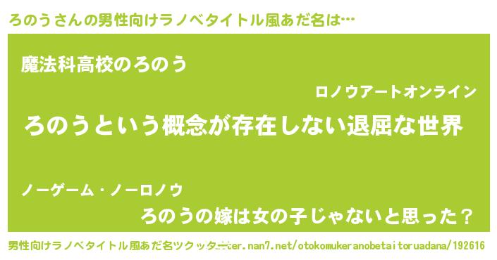 | 女子向けラノベタイトル風あだ名 | 『異世界で失敗しない100のろのう』 |