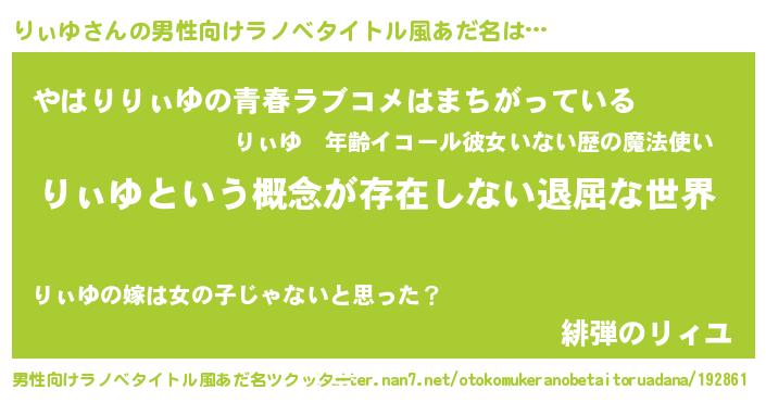 | 女子向けラノベタイトル風あだ名 | 『りぃゆの契約王妃』『りぃゆ伯爵の花嫁』 |