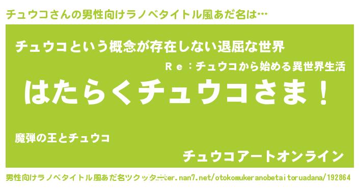 | 胡散臭い通販商品みたいなあだ名 | 『絶対に幸福をもたらす水素水…その名も「チュウコ」』 |
