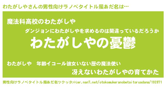 | 女子向けラノベタイトル風あだ名 | 『(仮)わたがしやのやんごとなき事情』 |