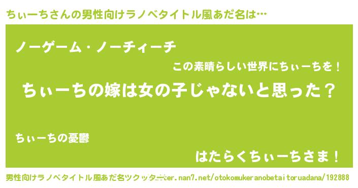 | 女子向けラノベタイトル風あだ名 | 『ちぃーちの卵を拾いまして』 |