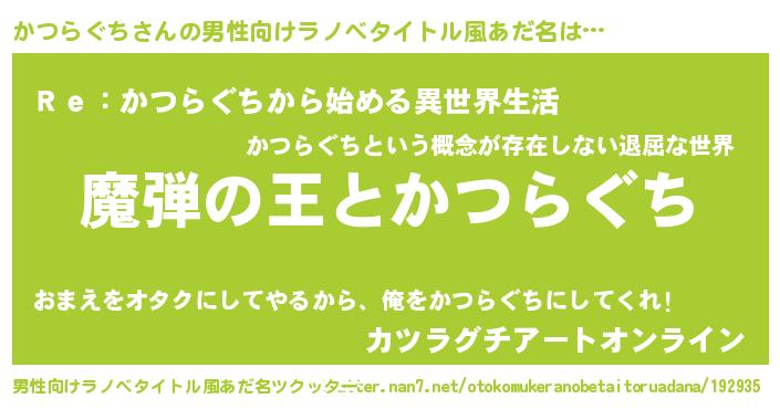 | 女子向けラノベタイトル風あだ名 | 『乙女ゲームの破滅フラグしかない悪役かつらぐちに転生してしまった…』 |