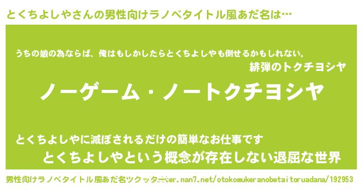 | 伝説のあだ名 | 『救世主となる錬金術士とくちよしや』 |