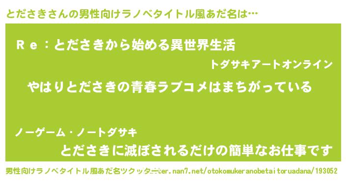 | ファンタジー風あだ名 | 『エターナルトダサキー』『ゼトダトゥ』 |