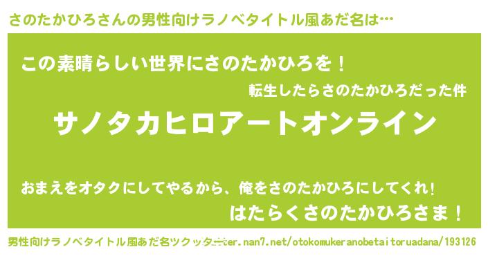 | 女子向けラノベタイトル風あだ名 | 『誰かこのさのたかひろを説明してください! ~契約から始まるウェディング~』 |