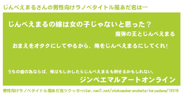 | 女子向けラノベタイトル風あだ名 | 『じんべえまる夫妻のなれそめ』 |