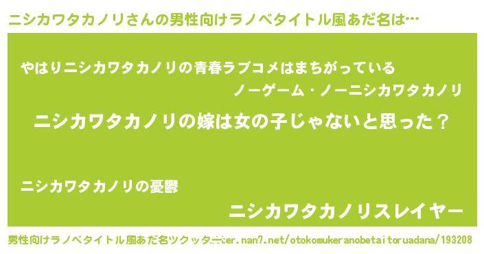 | 女子向けラノベタイトル風あだ名 | 『ニシカワタカノリ様がみてる』 |