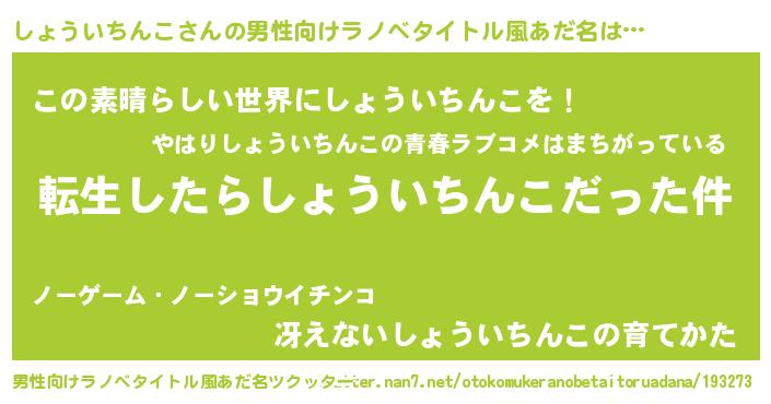 | 女子向けラノベタイトル風あだ名 | 『しょういちんこの玉の輿計画!』 |