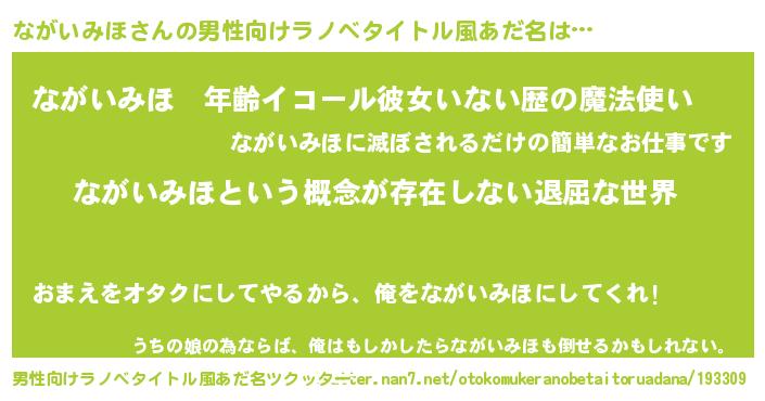 | 女子向けラノベタイトル風あだ名 | 『異世界で失敗しない100のながいみほ』 |