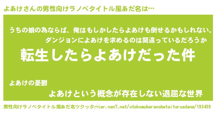 | 女子向けラノベタイトル風あだ名 | 『よあけの玉の輿計画!』 |