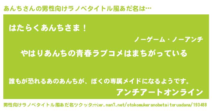 | 女子向けラノベタイトル風あだ名 | 『あんちの雑貨屋さん』『あんち恋絵巻』 |