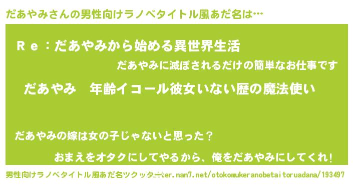 | 女子向けラノベタイトル風あだ名 | 『だあやみの玉の輿計画!』 |