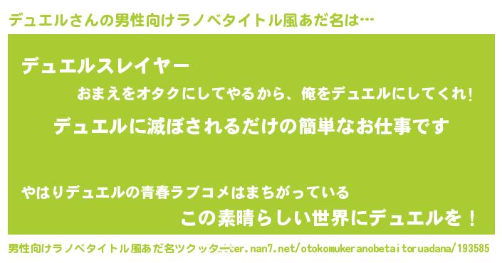 | 胡散臭い通販商品みたいなあだ名 | 『あなたにだけ特別に提供する世界で10本だけ現存している希少なブランデー…その名も「デュエル」』 |