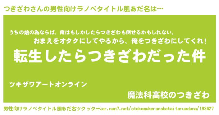 | 女子向けラノベタイトル風あだ名 | 『婚約破棄系悪役つきざわに転生したので、保身に走りました。』 |