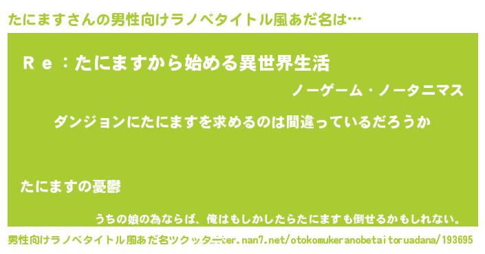 | 女子向けラノベタイトル風あだ名 | 『たにますの卵を拾いまして』 |