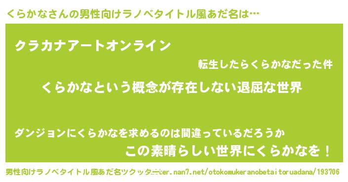 | 女子向けラノベタイトル風あだ名 | 『異世界で失敗しない100のくらかな』 |