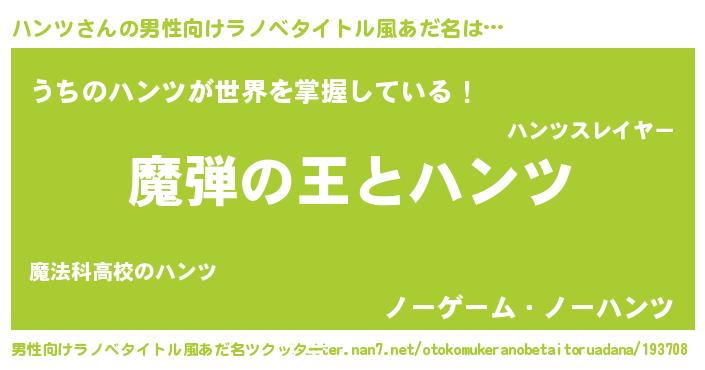 | 女子向けラノベタイトル風あだ名 | 『乙女ゲームの破滅フラグしかない悪役ハンツに転生してしまった…』 |