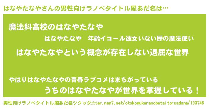 | 女子向けラノベタイトル風あだ名 | 『異世界で失敗しない100のはなやたなや』 |
