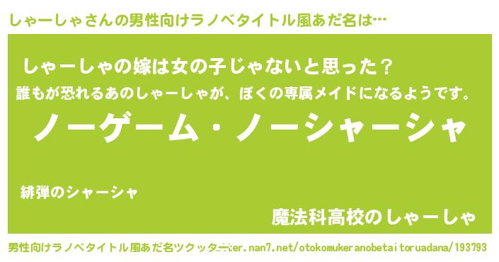 | 女子向けラノベタイトル風あだ名 | 『死神しゃーしゃの再婚』 |