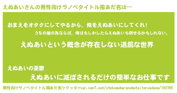 | 女子向けラノベタイトル風あだ名 | 『異世界で失敗しない100のえぬあい』 |