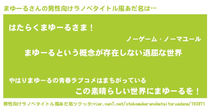 | 胡散臭い通販商品みたいなあだ名 | 『来世でも幸せになれる健康食品…その名も「まゆーる」』 |