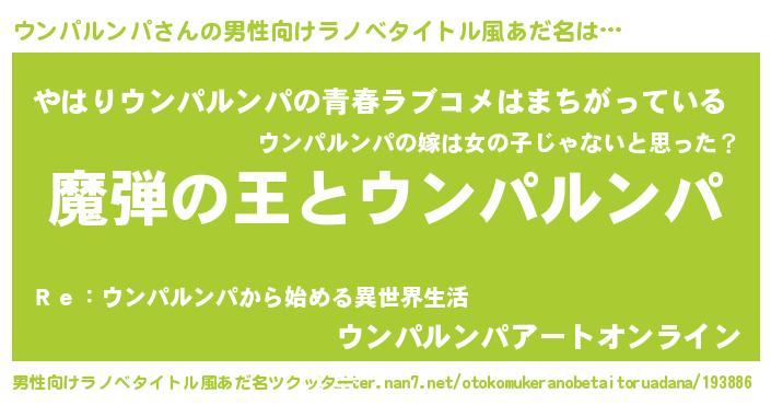 | 女子向けラノベタイトル風あだ名 | 『ウンパルンパが死なない童話 林檎のウンパルンパの診療簿』 |
