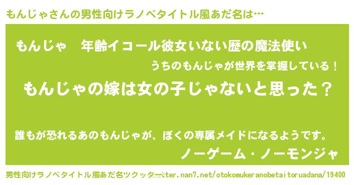 | 女子向けラノベタイトル風あだ名 | 『もんじゃの卵を拾いまして』 |
