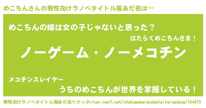 | 女子向けラノベタイトル風あだ名 | 『死神めこちんの再婚』 |