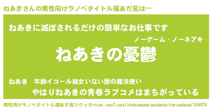 | 女子向けラノベタイトル風あだ名 | 『(仮)ねあきのやんごとなき事情』 |