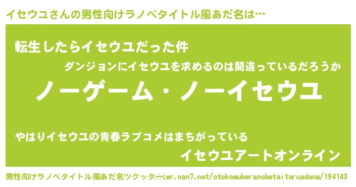 | 女子向けラノベタイトル風あだ名 | 『死神イセウユの再婚』 |
