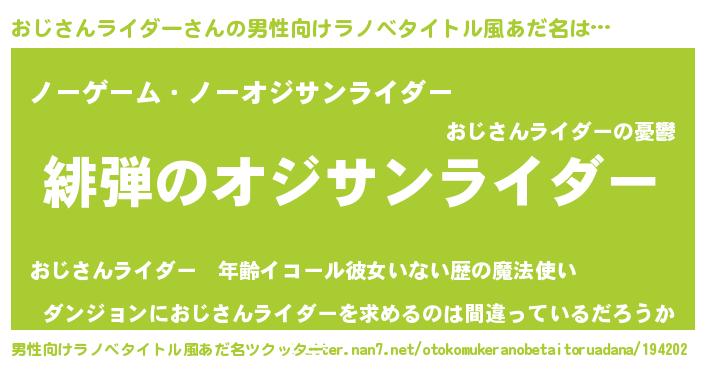| 女子向けラノベタイトル風あだ名 | 『シンデレラおじさんライダー家の靴箱館』 |