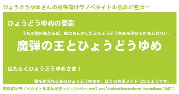 | 女子向けラノベタイトル風あだ名 | 『ひょうどうゆめが死なない童話 林檎のひょうどうゆめの診療簿』 |