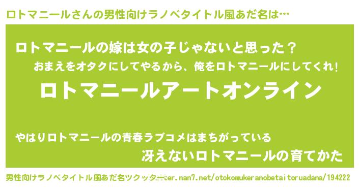 | 胡散臭い通販商品みたいなあだ名 | 『億万長者になれる霊験あらたかなお札…その名も「ロトマニール」』 |
