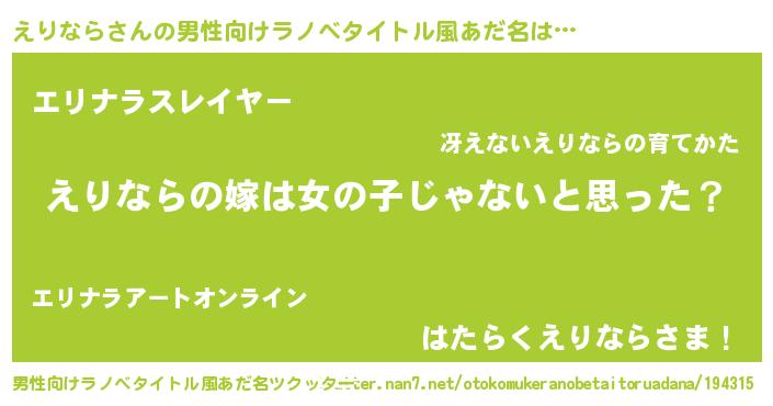 | 女子向けラノベタイトル風あだ名 | 『えりならの卵を拾いまして』 |
